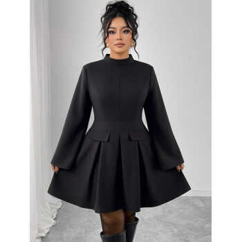 Robe mini élégante grandes tailles, col montant, manches lanternes, ourlet volant. Chic avec fausses poches 66,00$