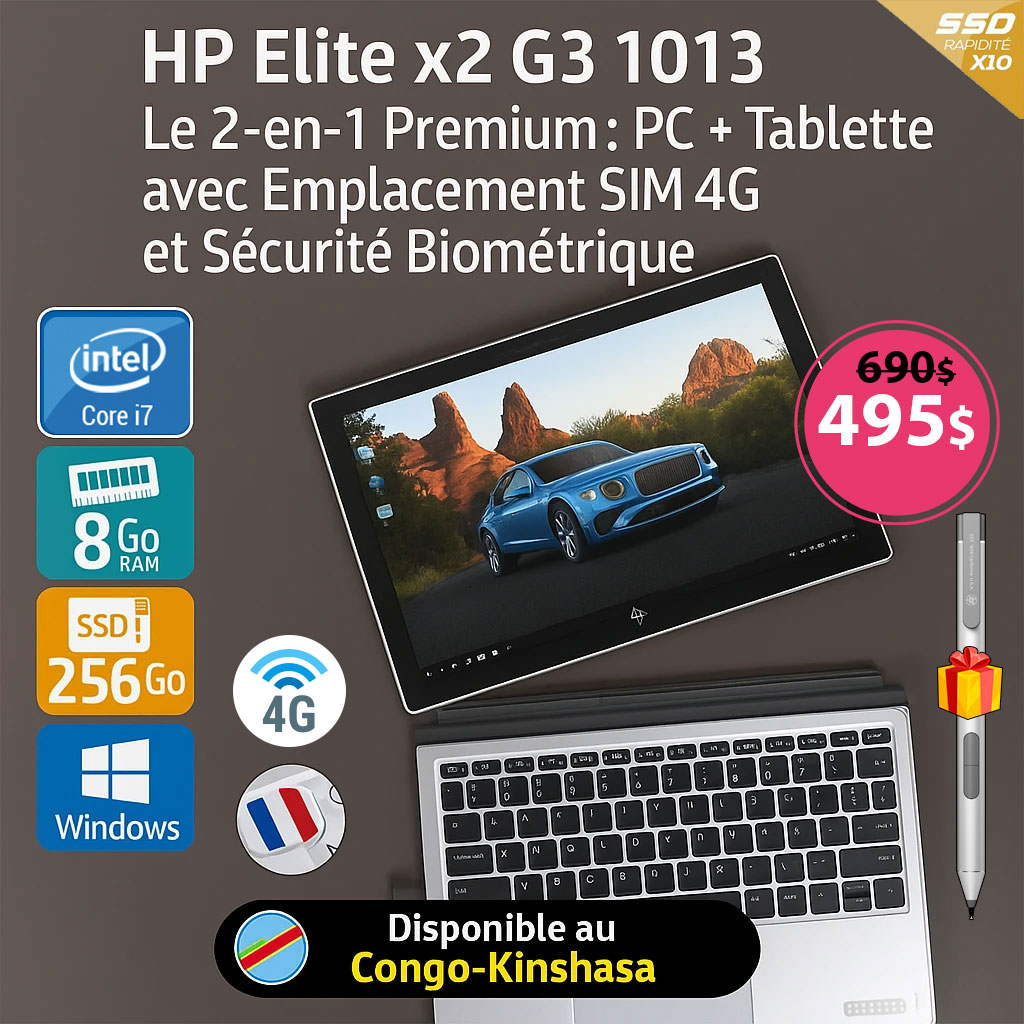 HP Elite X2 G3 1013 – 2 en 1 | i7 – 8 Go – 256 Go SSD – 4G – Sécurité biométrique – Écran Stylo Actif – AZERTY